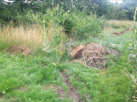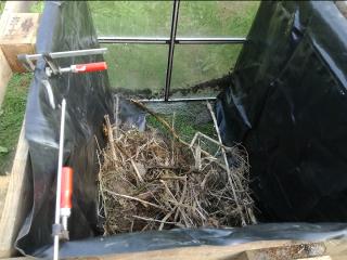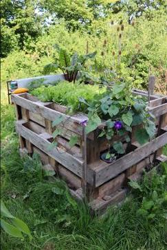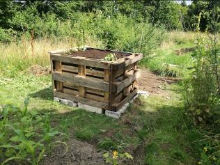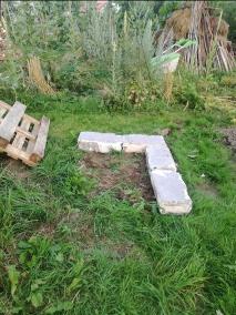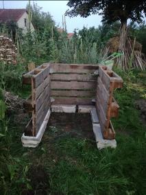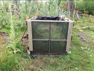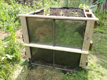 Zunächst wurde ein geeigneter Standort ausgewählt, bei dem genügend Platz vorhanden war, um ringsum zu werkeln. Die Ausrichtung wurde so gewählt, dass das Fenster an der Nordseite angebracht werden konnte, denn Wurzeln wachsen bekanntlich von der Sonne weg, eben in den dunklen Boden. Also darf auch trotz Beschattung nur wenig Licht bzw. Wärme am Wurzelfenster ankommen. Ein Fundament als Feuchtigkeitssperre wurde mit alten Betonsteinen gelegt, darauf wurden Europaletten mit der Oberseite nach „Innen“ aufgestellt und befestigt. Als Schutz und als Innenauskleidung wurde eine Folie befestigt. Nun kann beim Befüllen die Erde nicht durchrieseln und bei Regen oder durch Gießen wird das Holz nicht durch Stocknässe gefährdet. Eine ausgediente Fensterscheibe wurde mittels Holzlatten an der Nordseite befestigt, und das neu geschaffene Hochbeet mit dem Erdaushub und Astschnitt, anschließend mit Erde und Kompost aus eigener Herstellung befüllt. Hier wuchs in 2021 dann Mangold, Karotten, Salate, Paprika und eine Süßkartoffel.
