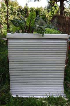 Über der Fensterscheibe brachten wir noch einen alten Rollokasten an, um das Wurzelwerk zu schützen. Zum Betrachten kann dieser aufgerollt werden.