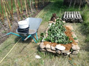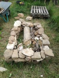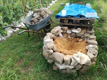 Fundament aus Feldsteinen, Füllmaterial Totholz, Sand und Astschnitt |