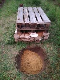 Ganze Euro-Paletten und Fundament für Steinpyramide, Humus abgetragen |