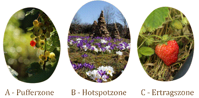 Pufferzone: Totholzhaufen, Beerenhecke, einheimische Sträucher, (Obst-) Bäume
